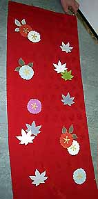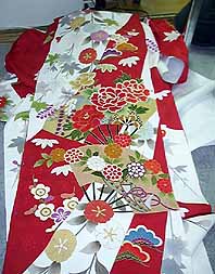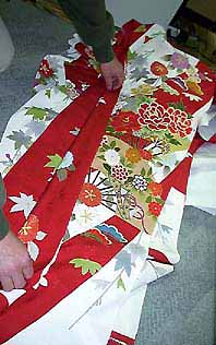 「振り」と呼ばれる別布を広げたところです。 仕立て上がった時には縦に二つ折り状態になり、袖を振った時にチラリと見えるわけです。 |