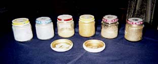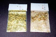 | ちょっとピンぼけでスミマセン m(_ _)m こちらは粉末というか、小さな切片状になった金です。 これを水やバインダで溶いたり、メルマガで説明した「振り金」という技法に用いたりします。 同じ形状でも、左右の色合いを見比べると、右側は少し赤味が入っているのがおわかりでしょうか? このように、金の色にも多くのバリエーションがあります。また、それらを混色して使う場合もあります。 |